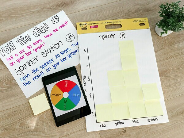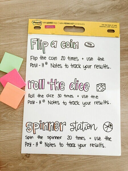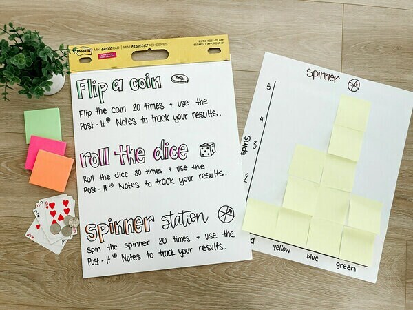 Use the Post-it® Super Sticky Mini Easel Pad to create instructions and bar graph outlines for each of the probability stations. Set up the materials each group needs and space them throughout the classroom. Each group will also need Post-it® Super Sticky Notes.