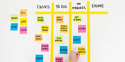 Find some empty wall space, or use Post-it® Easy Erase Surface, in a highly visible location. Use Scotch® Expressions Masking Tape to make a grid with four columns: Tasks, To Do, In Process and Done.