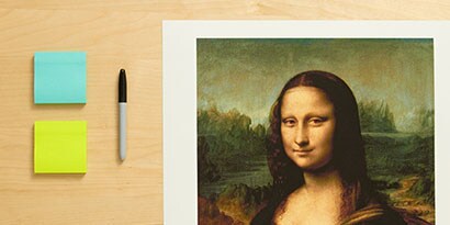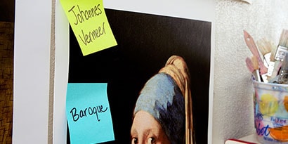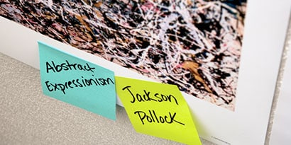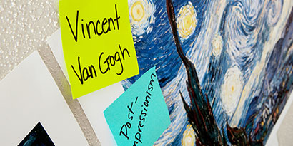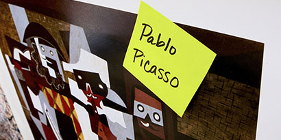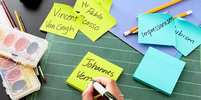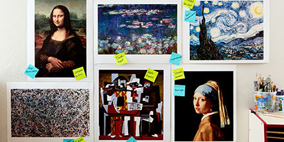 After selecting a number of famous works, such as those from Van Gogh, Picasso, Rembrandt or O'Keefe, label one color of Post-it® Notes with the artist's name. Next, label a different color of Post-it® Notes with artist's style/time period.