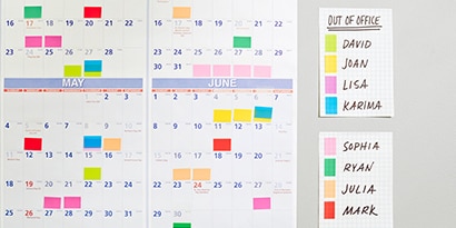 Next, assign a color to each person you manage — let’s say Molly is yellow — and whenever Molly has an appointment, use a yellow Post-it® Super Sticky Note 2 in. x 2 in. and stick it on the calendar on the appointment’s date and time. Once you’ve internalized which colors go with which people, you’ll be able to see exactly what’s happening with your entire team’s schedule at a glance without thinking — saving time and energy for you to focus on getting things done.