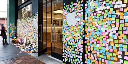 Not every example of community building with shared ideas is planned. Sometimes, people come together spontaneously, often around a loss or tragedy, to support each other via the simple sharing of messages of hope. When Steve Jobs passed away, the Apple store in Palo Alto became an impromptu memorial for him. Fans of Jobs, his company, and the impact he had on the world covered the front windows of the store in notes that expressed their sorrow, their love, and their hope for the future.