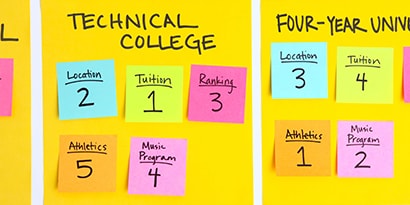 This is the time to think about your top variables for how to choose a college, such as reputation in your field of study, athletic programs, location, rating, tuition, etc. Grab a stack of Post-it® Super Sticky Notes 3 in. x 3 in. in multiple colors. Using 5 notes for each of your key variables, label each with the name of the variable (for example, Tuition) and number them from 1 to 5. Use a different color for each variable — that way, if you have 6 variables, you’ll end up with 30 notes in total, in 6 different colors. Stick them in a grid on the wall next to your big notes.