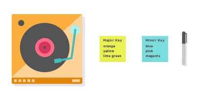 Listen to music that is composed in major key and write down all the colors you see. Now listen to music composed in minor key and do the same, writing down a list of colors the music makes you imagine. What colors did you associate most strongly with each song? Do you associate those same colors with the mood the songs evoke?