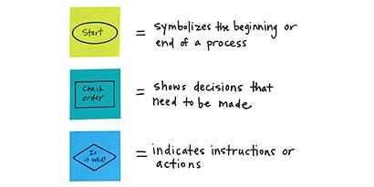 These symbols will be connected to each other by arrows, which show the pathways of the process and how everything relates.