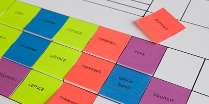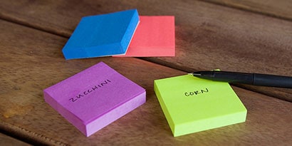 Collect some 2x2 Post-it® Super Sticky Notes in different colors, and label each color with the name of a plant you'd like in your garden. Create enough labeled notes for each plant to represent roughly the ratios you'd like in your garden. (If what you want to plant is quite small, each note can represent multiple plants, a small bed, or a particular arrangement of plants, as necessary.)