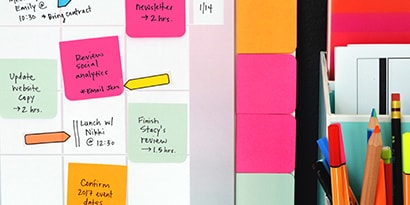There are times when being a great multi-tasker can make it tough to understand how to approach a project that’s got lots of steps or stages. The bucket method can help — it’s a system that helps you organize tasks into steps along a path that show you what’s been done, where you are now and what’s next. For instance, for one project, you could create three columns on your Post-it® Super Sticky Dry Erase Surface Sheet labeled Backlog, To-do, In Progress and Completed. Write each task that needs to be completed for that project on a Post-it® Super Sticky Note, 3 in. x 3 in. and place them where they need to be — because you can stick and re-stick your notes, they’ll move along your buckets as needed, helping you track individual tasks as they move through those stages. Not only can the bucket method help you manage your projects, but it might also help you find places where you can reduce the number of stages in a process or help tasks move faster.