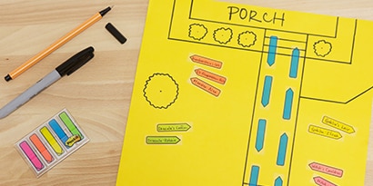 Start out by drawing your front yard on a Post-it® Big Pad sheet, then label each feature or section of the yard using Post-it® Flags. This way if you decide that Frankenstein’s Lab needs to switch with the witch and her cauldron, it’ll be a cinch. If you’re plotting out a haunted house, try using the same process of drawing and labeling each section of your home.