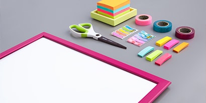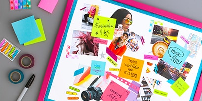 You’ll want a board where you can stick lots of things to inspire you, and you’ll want to find a spot for it where you’ll see it every day to remind you of what you want to achieve. Try covering a bulletin board with Post-it® Super Sticky Dry Erase Surface — you can cut it to any size board you want, and it’ll stick to just about any smooth surface. Or just use a sheet of cardboard, a piece of wall, or anything else you like.