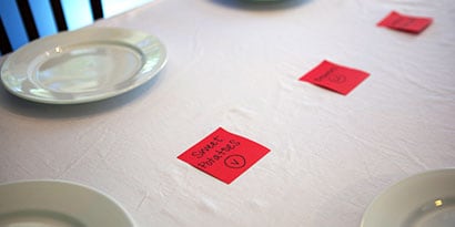 If you’ve got a large group, you can also make place cards out of Post-it® Notes to make sure that people from different departments or areas of the office get to know each other better. If you color code these notes by department, you can have everyone switch seats before dessert, and sit next to someone with a different colored note than their previous neighbor.