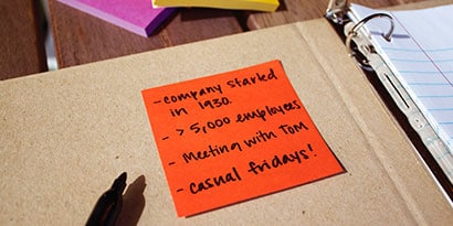 Can’t remember all those interview tips people (like us, for example) are always giving you? Write the stuff you absolutely need to remember on a and put it on the inside over of your interview folder. You’ve got an interview folder, right?
