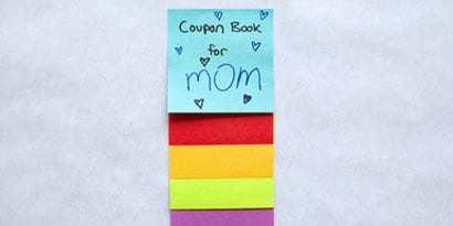 Create a coupon book on a pad of Post-it® Super Sticky Notes, where each note is good for a chore, favor or even just one-on-one time with kids and loved ones. Try things like Good for One Breakfast in Bed," or "Good for One Quiet Afternoon with No Interruptions."