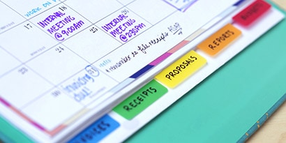 First, attach a calendar with the meeting’s name, date and time to the cover of a 3-ring binder. Make your agenda page one, followed by pertinent documents (proposals, budgets, reports, schedules, etc.). You can easily separate the information by using Post-it® Tabs with color-coded references on the agenda.