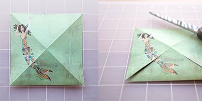 Fold both squares diagonally in each direction, and unfold. Cut along each crease two-thirds of the way into the square’s center.