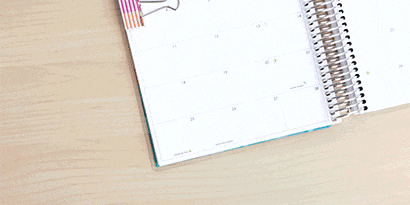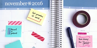 2. The next step is to make your goals beautiful. Write each of your most important goals beautifully on a Post-it® Note, 1.5 in. x 2 in. using a color that inspires you – so, for saving for a beach vacation, you might use a beautiful ocean blue, or for getting a raise at work, you might choose a green that reminds you of money – and stick those notes on the dates when you want to achieve your goals. Don’t feel pressured to put them on exactly the right dates – you can move the notes and re-stick them over and over again! If some goals are really long-term, you might even need to use the pages at the back of your planner to show that they’ll happen next year – or later.