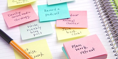 1. The first step is to find your dreams. What are you working towards, and what motivates you to do a great job? There might be lots of things – in fact, there should be – so grab a stack of Post-it® Notes, 1.5 in. x 2 in. and start writing them down. Take five minutes and come up with as many goals and dreams as you can – no matter how big. Once you’ve finished, pick out the most important goals, at least five or six, and jot them down on a Post-it® Lined Notes, 4 in. x 6 in., that you can stick, temporarily, to the inside cover of your planner or on your work surface for the next step.