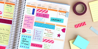Now, from each goal, work backward through your planner to figure out when you should take the steps that will help you achieve it. Write your steps on more Post-it® Notes, 1.5 in. x 2 in. that coordinate with the color of the long-term goal, or, if you need to take up less space, try Post-it® Page Markers in coordinating colors instead. Of course, you can always move and re-stick your tasks and steps as your schedule shifts -- or if you miss completing a step during your day or week, don’t worry – you can re-stick the note or page marker on a new date and try again later. Remind yourself that life is even more beautiful and inspiring when you learn from your mistakes and grow stronger as a result.