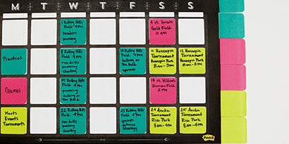 To help with putting a practice plan together, use a weekly calendar like the Post-it® Notes Weekly Planner. It includes 2" x 2" Post-it® Full Adhesive Notes in three different colors, so you can use one color for practice days, another for game days, and another for team meeting days or special events like tournaments. Four boxes under each day on the planner can be filled with specific instructions for the day, like practice location, warm-up instructions, plays to practice, player positions or name of the onsite coach.