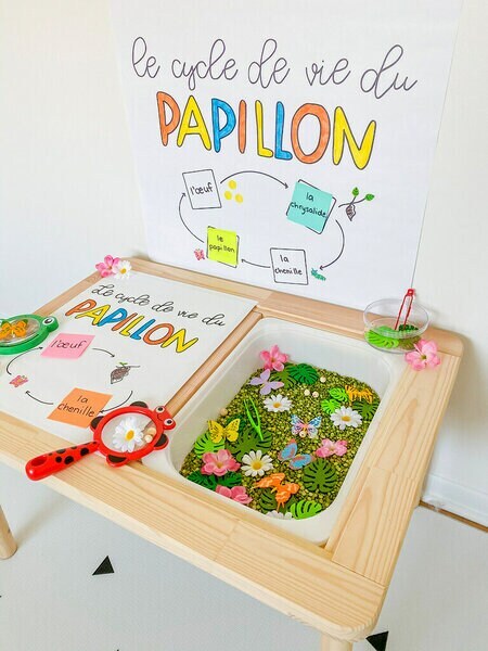 Explorez les éléments de votre bac sensoriel et prenez le temps d’associer chaque composante à une étape du cycle de vie qui est représentée sur l’affiche. Il s’agit d’une belle occassion pour pratiquer ses habiletés de tri!